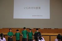 13日(金)にいじめについて考える会(人権集会)・合唱大会が行われました。最初に生徒会が身近に起きそうな人権に関するトラブルの劇を行い、問題提起をしました。その後、各学年が考えた「いじめゼロ宣言」を発表しました。各学年の発表が終わり、合唱を披露しました。校歌と学年で選んだ課題曲を歌いました。どの学年も練習の時よりも元気よく大きな歌声を披露しました。